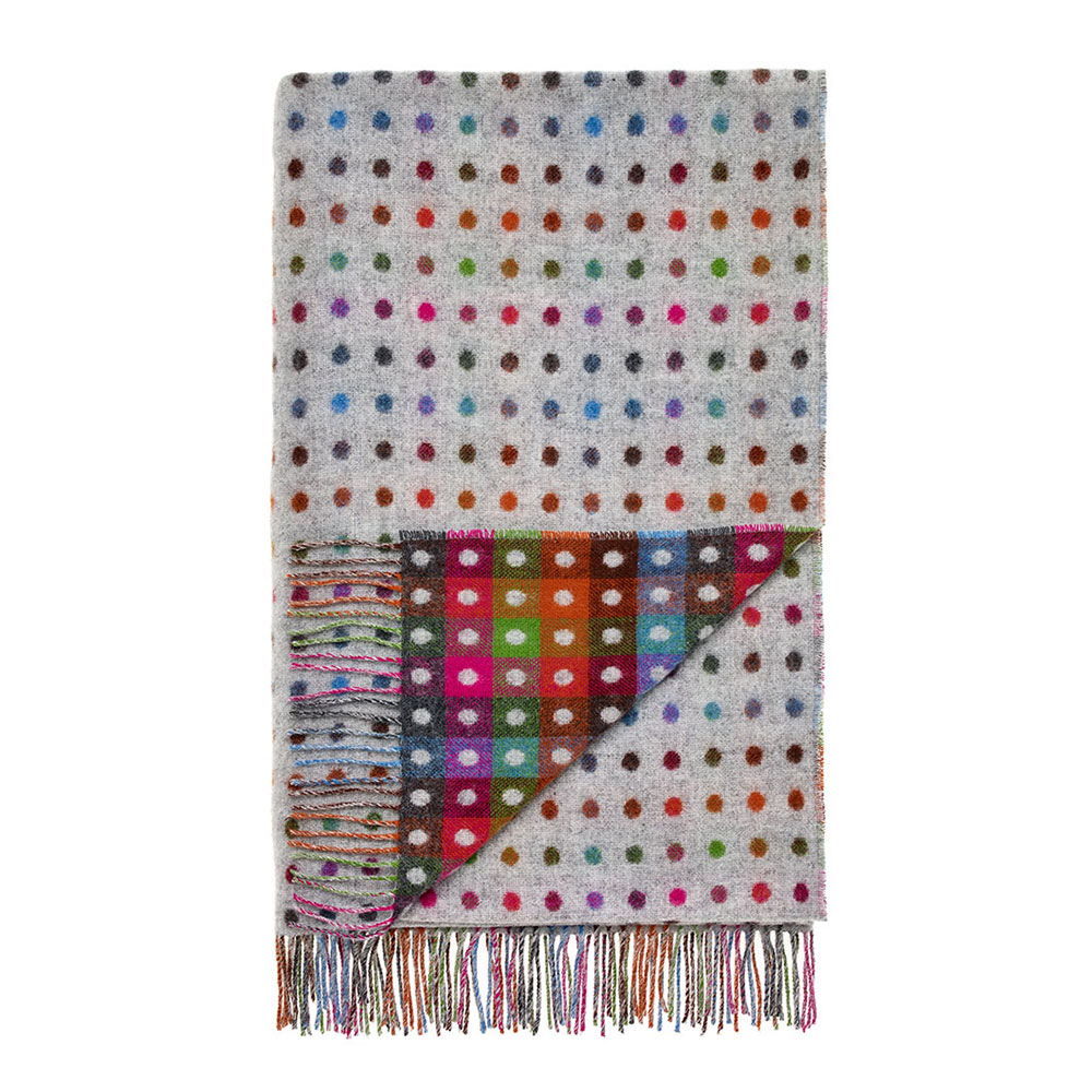 Reversible 100% Merino Lambswool throw, pleasing on the eye with modern, trendy vibrant colors. It has a quiet side with tasteful multi colored spots or it can make a statement with it's louder spot-checked reverse side.