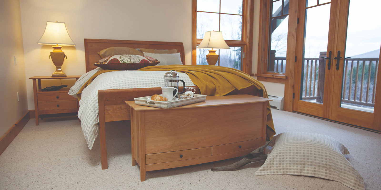 The guest bedroom was charming with its natural light and beautiful glass doors. They envisioned a full cherry wood bed set to compliment the framing of their windows. A Vernon bed with a Chelsea dresser, blanket chest and nightstands fit the bill. This collection created a warm and cozy atmosphere for the in-laws.