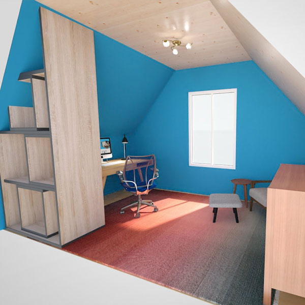 Perhaps the pièce de résistance of this home office transformation was the heavily modified Averill Room Divider. Pulling obvious inspiration from the Averill, this piece was custom developed to sit perfectly against the room's pitched roofline while also adding storage at the bottom to match the height of the desk nested behind it.