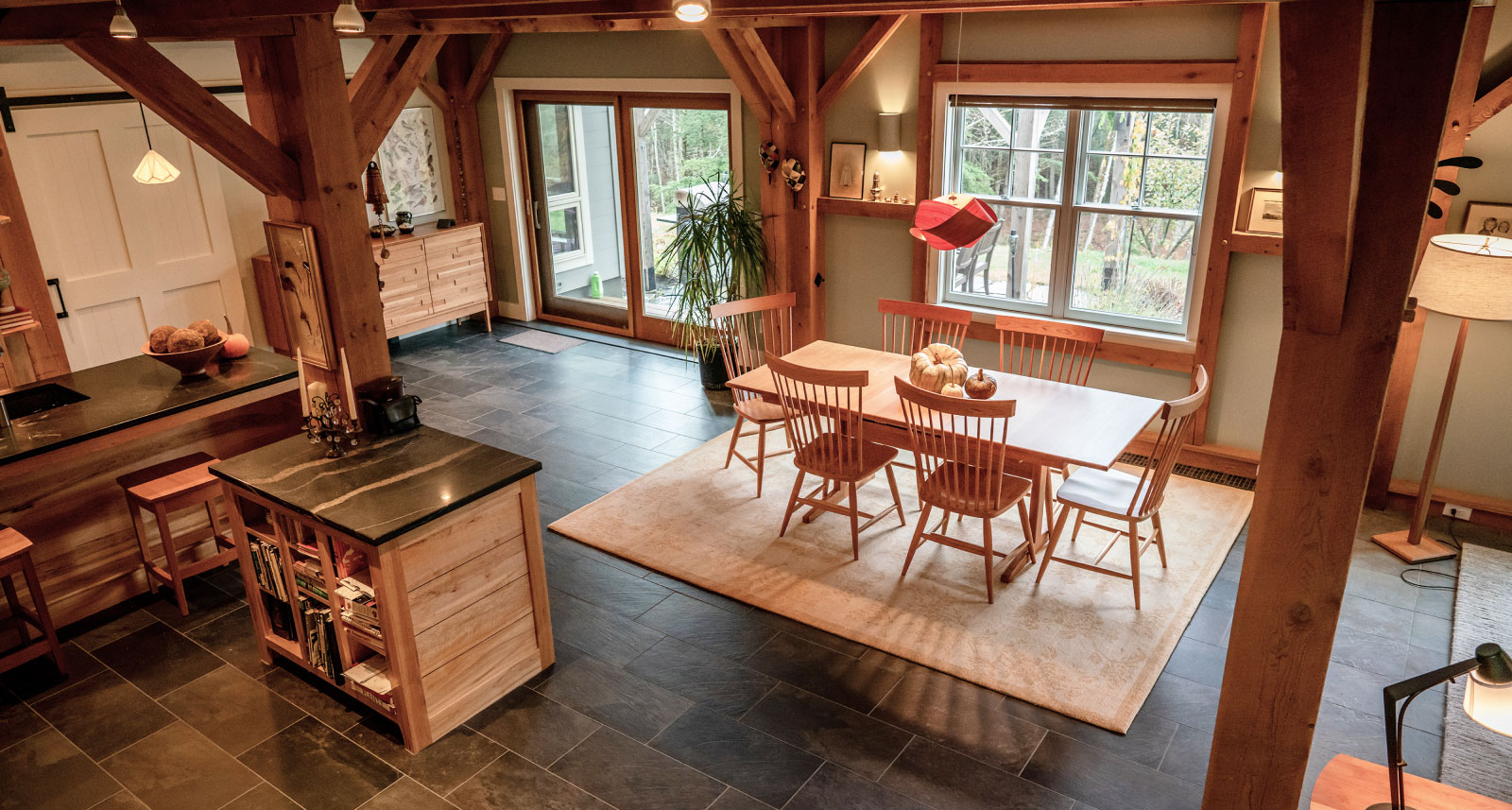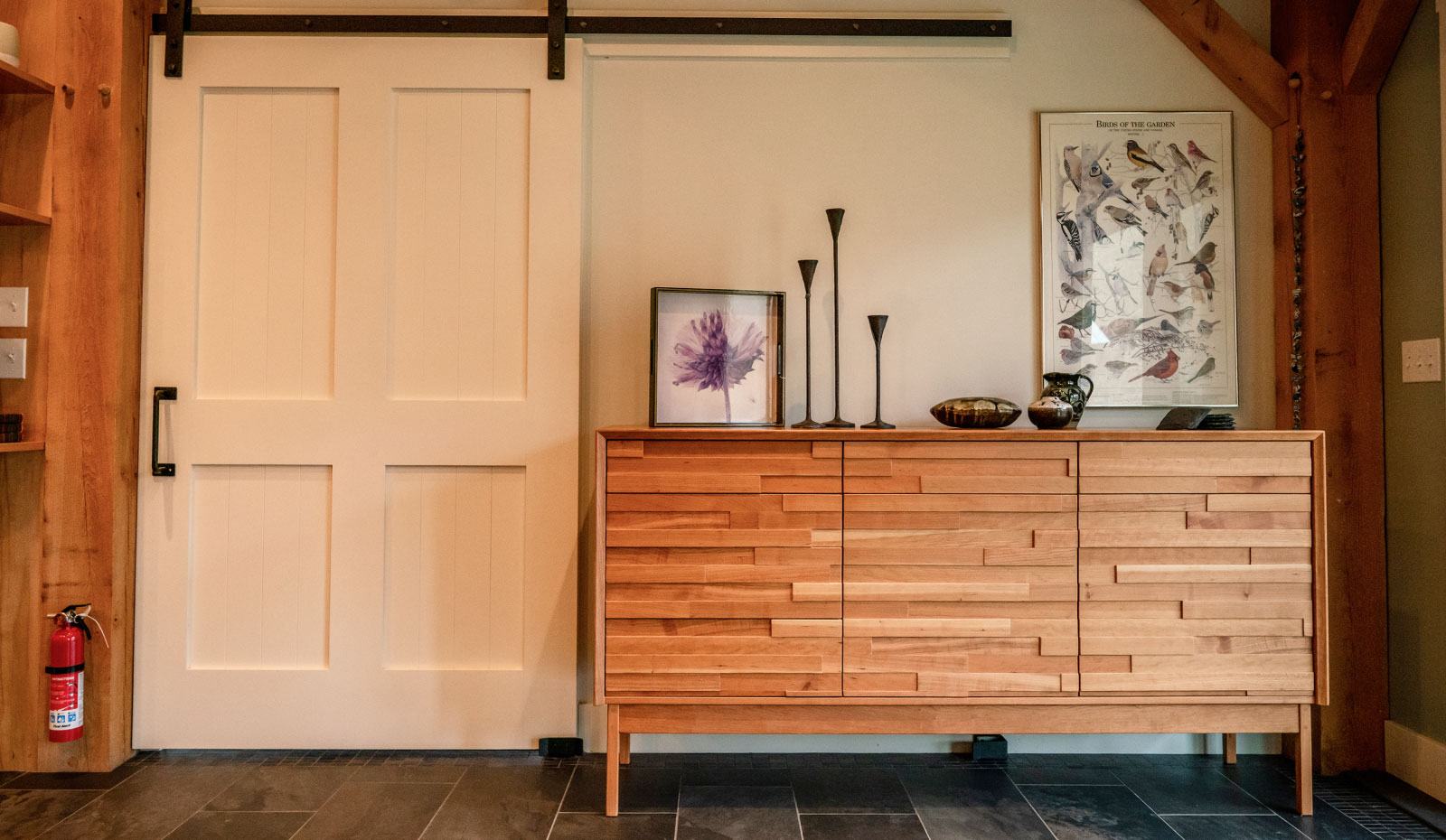 After visiting the home we developed a detailed plan that created defined spaces within the open floor plan. By selecting a mix of contemporary and shaker-inspired pieces, including the brand new Corinth Server pictured here, we were able to create a beautiful livable environment that was at once contemporary, and payed tribute to the classic post and beam construction of the property.