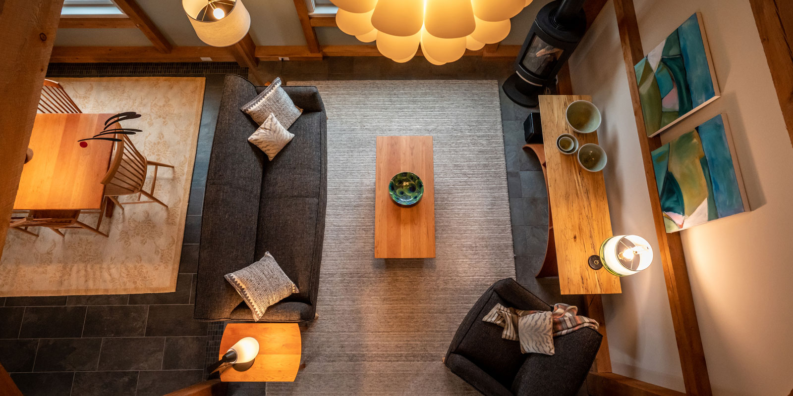 The clean lines of the Calais couch and chair work to complement the design of the home and define the living space. The Belmont coffee table and console table add a modern elegance to the room. The console table features a truly stunning spalted maple top that complements the maple cabinetry from the kitchen. Neutral rugs from Innerasia and Feizy were chosen to define dining and living areas.