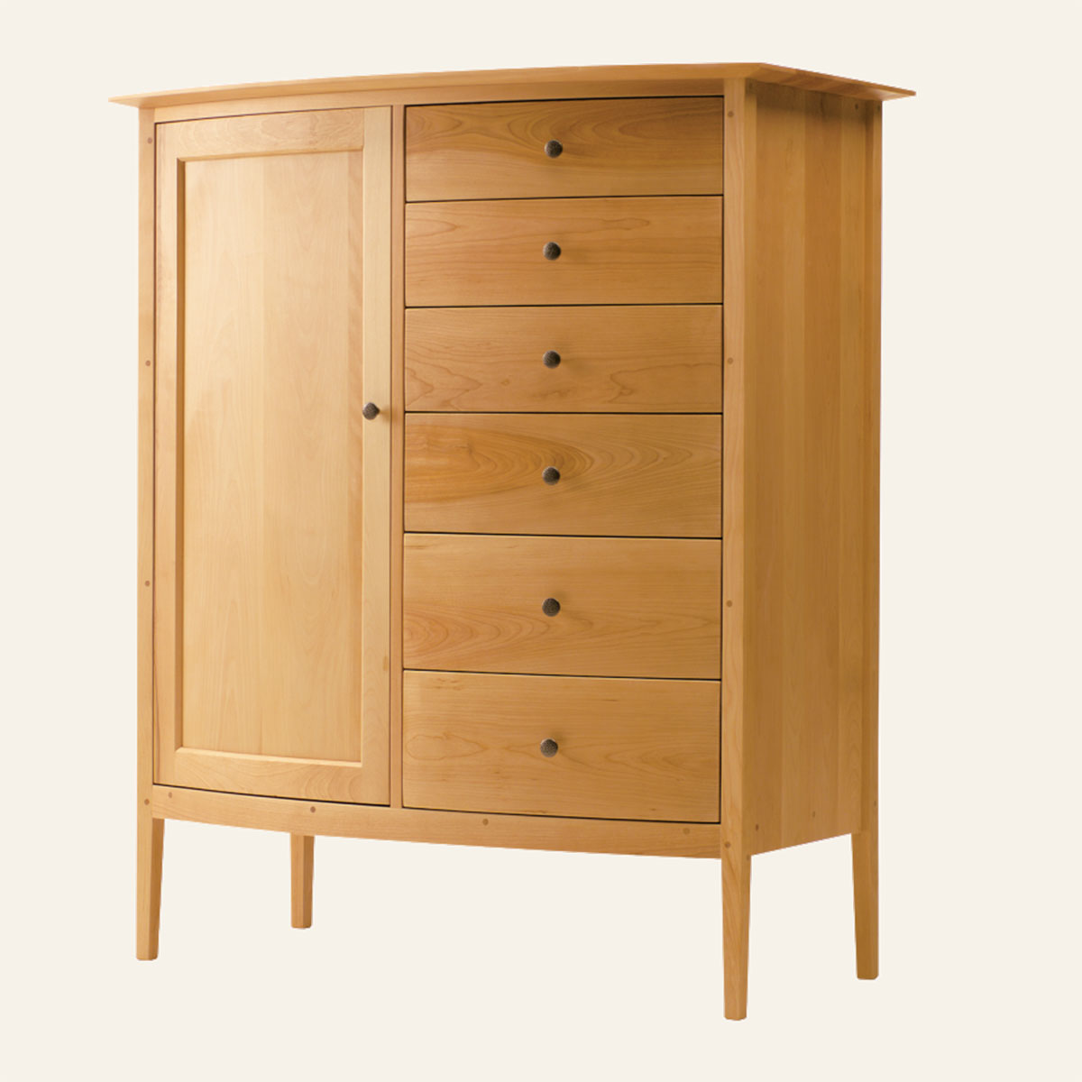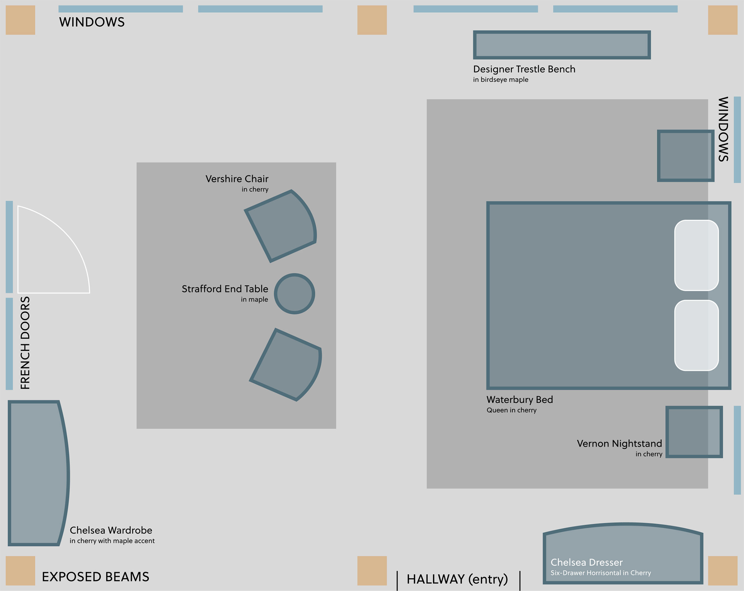 We chose a collection of pieces with simple elegance. The subtle bowed front of the Chelsea wardrobe and dresser echo the curved headboard of the Waterbury bed and legs of the Vernon nightstand.