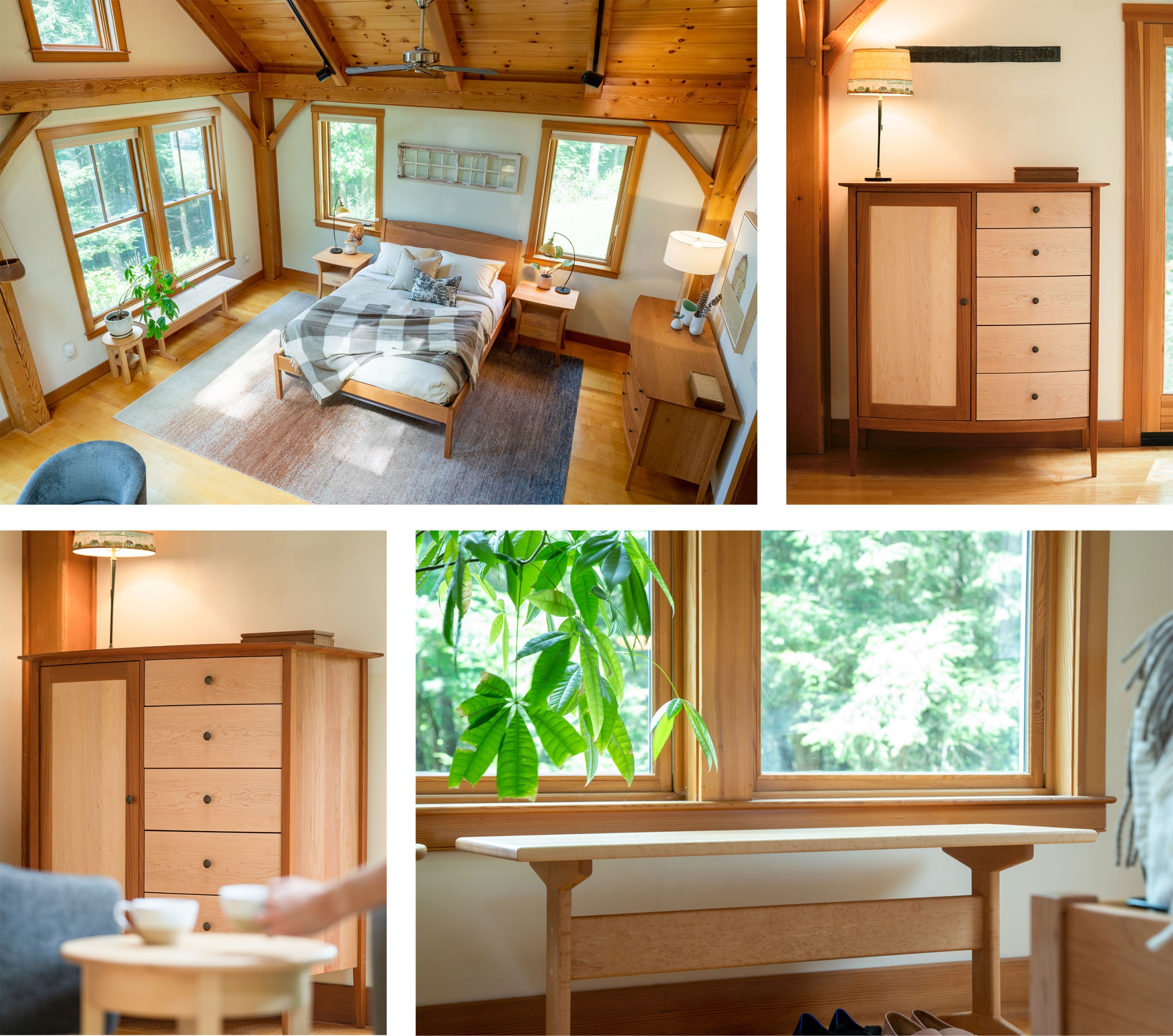 All pieces were built in a combination of solid cherry and maple hardwood. The warm light tones keep the space feeling spacious and light.