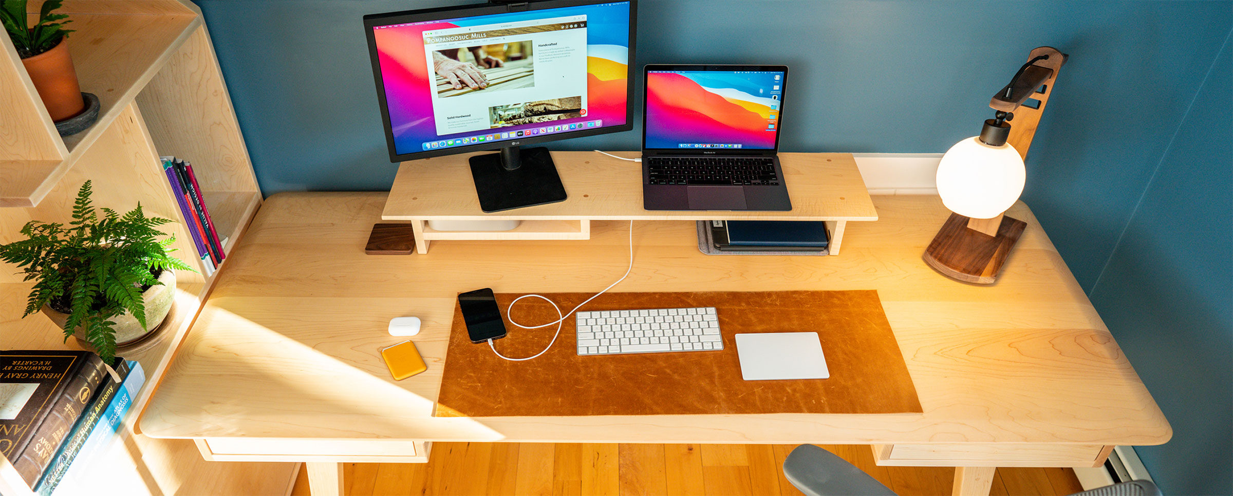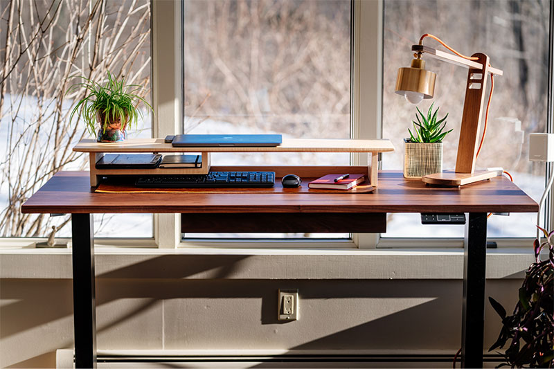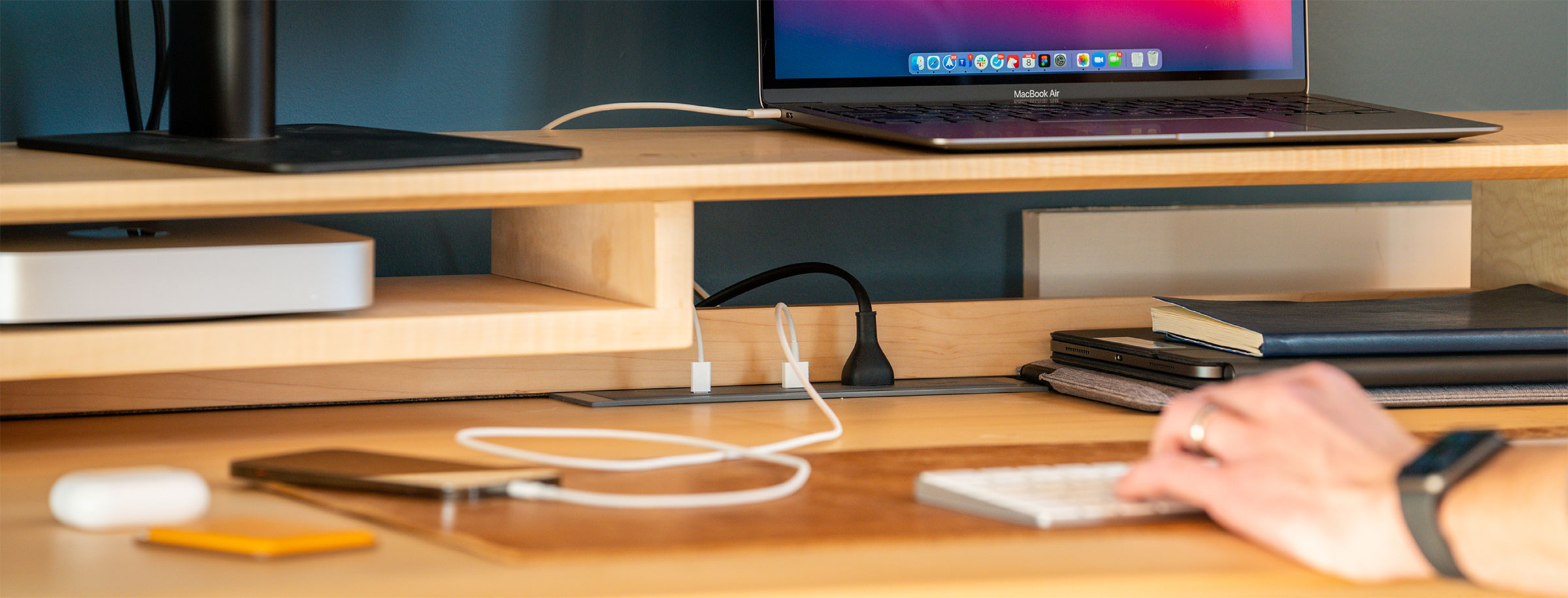 This is a flush mount option that is integrated into your work surface. A perfect solution that’s discreet, while also being convenient; perfect for hiding away under your Mt. Abraham Desk Shelf, or tucked neatly into the corner of your desk.