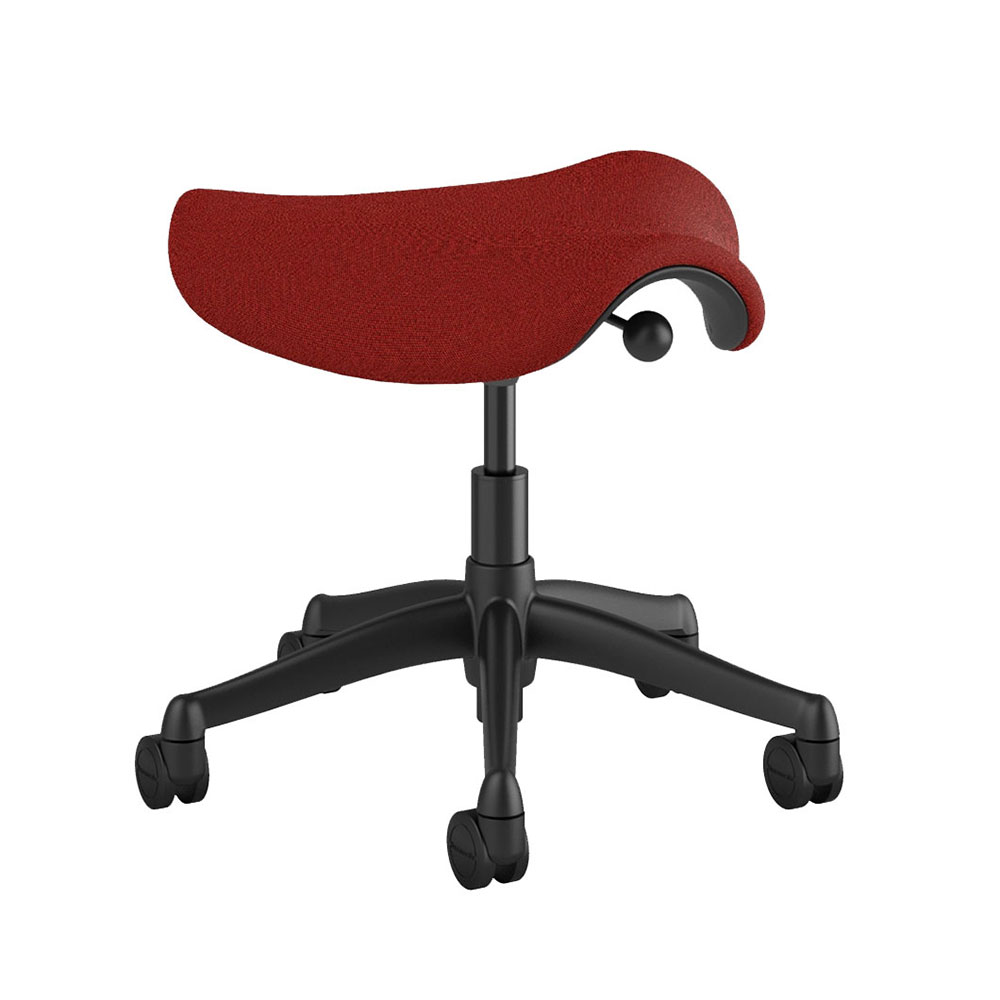 Freedom Saddle Stool with height adjust lever showing, with graphite 5-star base on standard hard casters. The standard 5” cylinder is appropriate for 95% of users, which provides seat height range of 17.3"-22.1". Saddle seat in Fourtis-winterberry fabric.