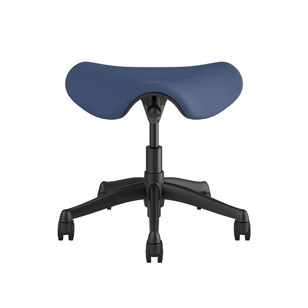 Freedom Saddle Stool, height adjustable, with graphite 5-star base on standard hard casters. The standard 5” cylinder is appropriate for 95% of users, which provides seat height range of 17.3"-22.1". Saddle seat in Fourtis-hyacinth fabric.