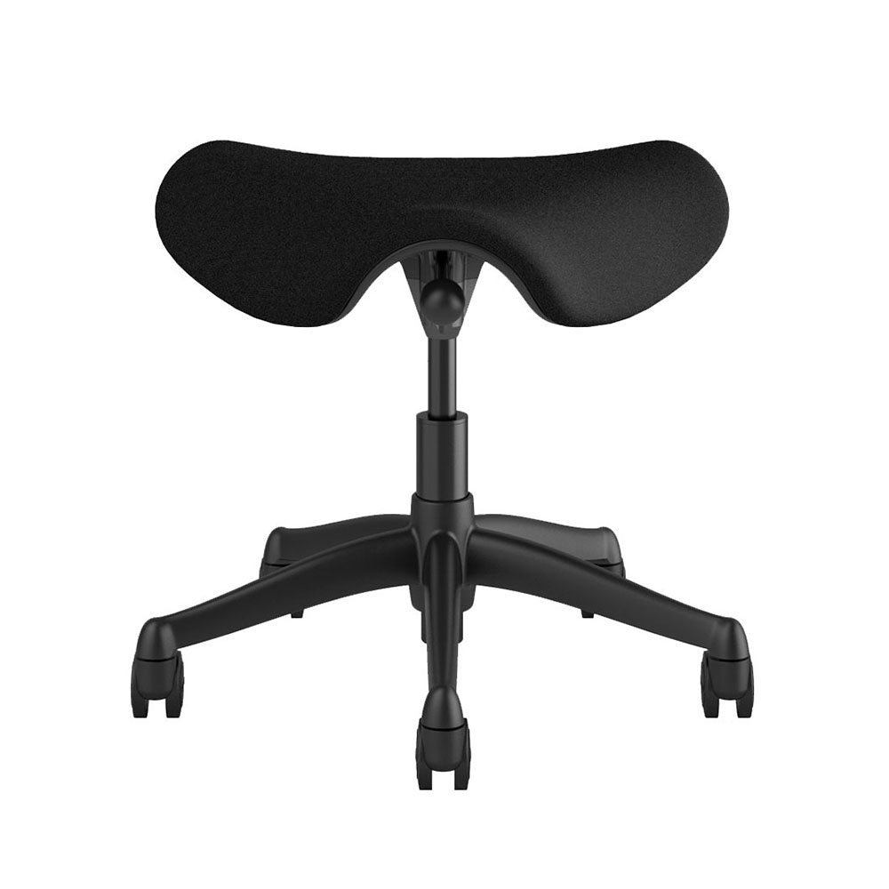 Freedom Saddle Stool, height adjustable, with graphite 5-star base on standard hard casters. The standard 5” cylinder is appropriate for 95% of users, which provides seat height range of 17.3"-22.1". Saddle seat in Fourtis-black fabric.